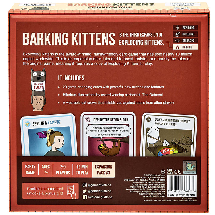 Click to expand Tap to zoom Barking Kittens - an Exploding Kittens Expansion by EXPLODING KITTENS, INC. Sold out $14.99 | / 1 2 3 4 5 6 7 8 9 10+ Quantity Quantity Sold out An Expansion for Exploding Kittens! Base game is required to play.